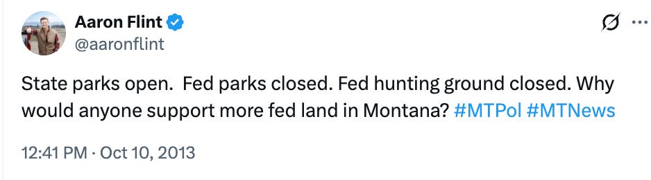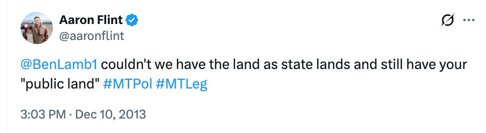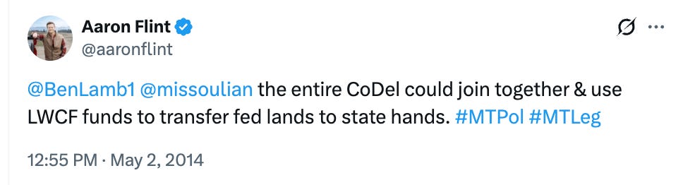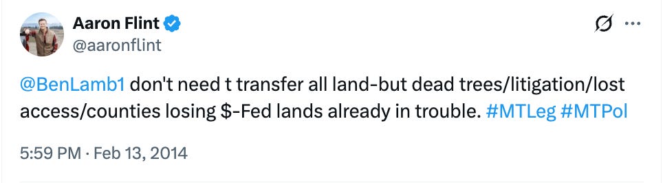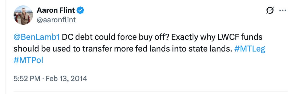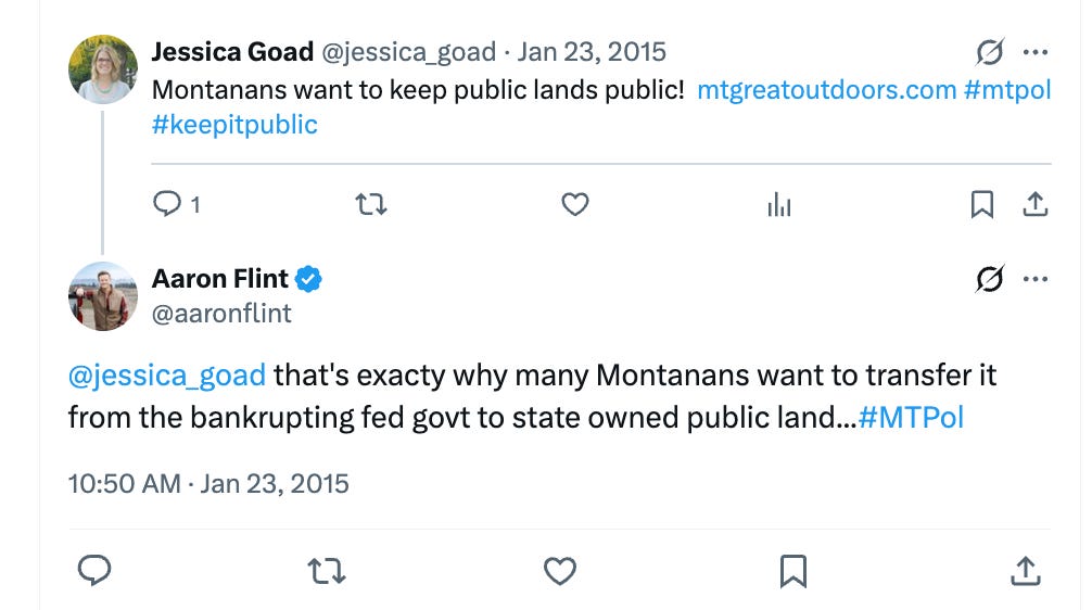 In a 2015 post to X (formerly Twitter), Flint declared that “many Montanans want to transfer it from the bankrupting fed govt to state owned public land.”
