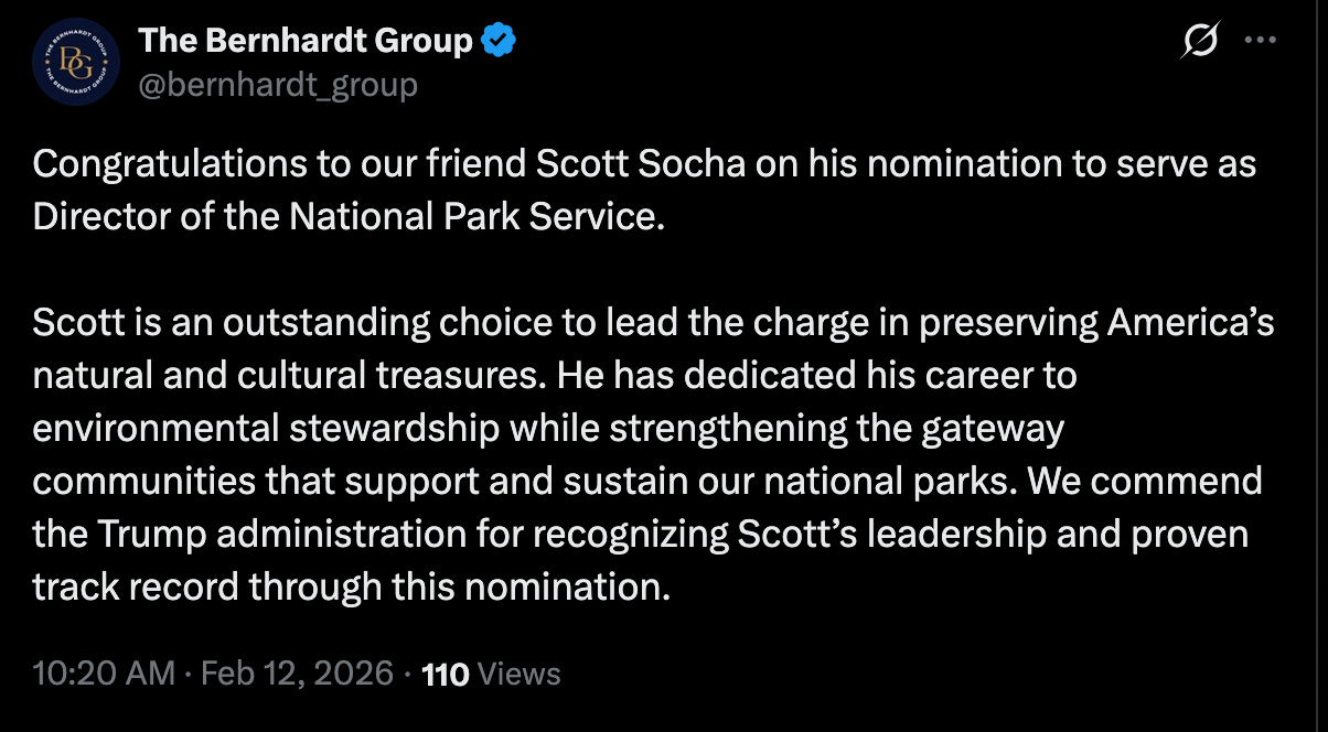 When Socha was nominated to lead NPS, The Bernhardt Group publicly gushed about their friend’s good fortune.